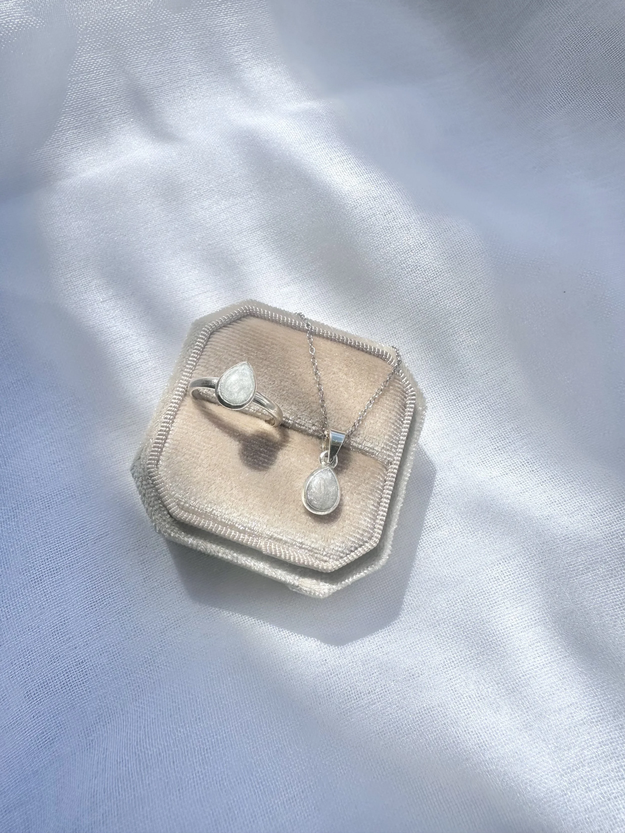 Your jewellery is lovingly handcrafted, treating your loved ones cremains (or other inclusion) with the utmost respect and care throughout the entire process. You can even request a special song to be played during the process. The turnaround time is currently 8 weeks.
